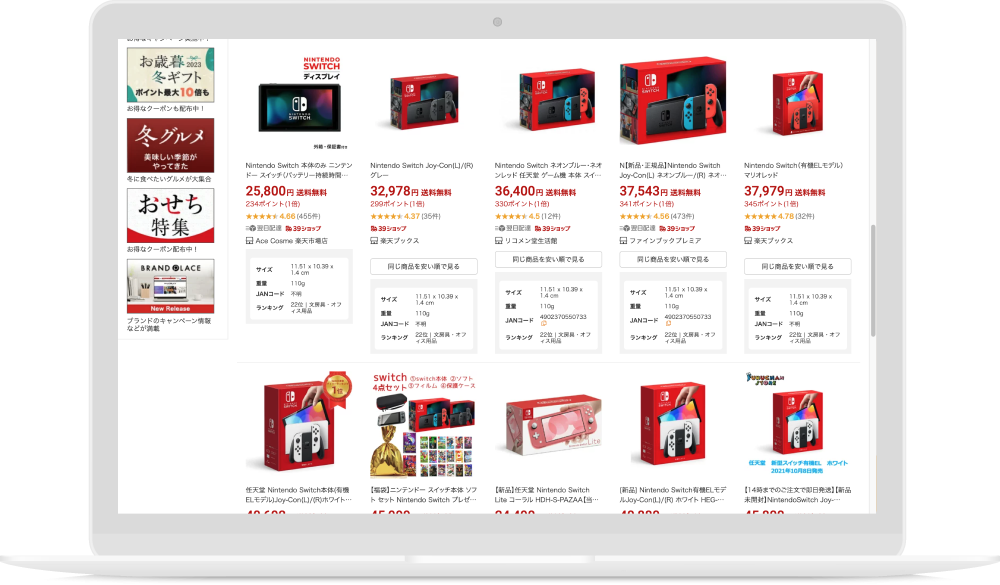 クロスサーチはYahoo!ショッピング、楽天などの大型ECモールはもちろん、 個人で運営している小さなショップやメーカー公式サイトなどにも対応しているため、 インターネット上で販売されているすべての商品を仕入れ対象にすることが可能です。